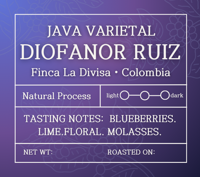 Shop › Java- Diofanor Ruiz Image 1 of 1 Java- Diofanor Ruiz $25.00 Colombia - Finca La Divisa8 oz onlyTasting notes: Blueberries. Lime. Floral. Molasses.Roast level: Light Add To Cart Added! Colombia - Finca La Divisa8 oz onlyTasting notes: Blueberries. Lime. Floral. Molasses.Roast level: Light